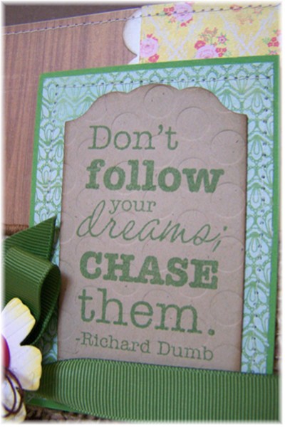I added lots of texture to this card with the burlap ribbon, stitching, and impressed polka dots and woodgrain details.  I even tucked in a strip of SIMPLY SCALLOPS. Here's a close up of the quote panel.