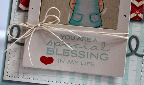 I added a bit of Sno Cone card stock to pull together my color scheme. I cut one of the stitched flags from Blueprints 2 Die-namics and stamped a few more hearts from the Cheerful Blessings stamp set. This time I added them in Berrylicious ink.